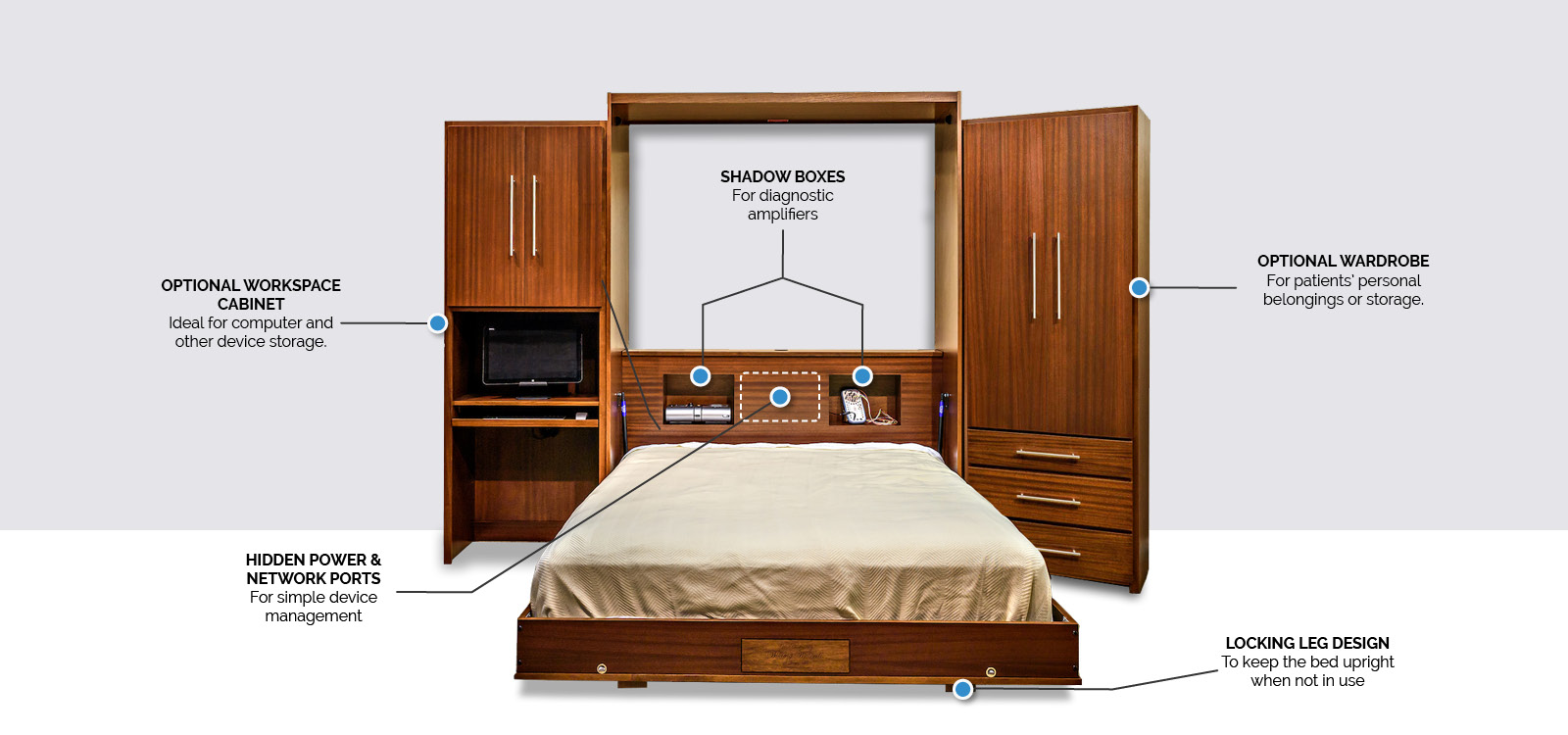 Murphy beds are a very popular solution for sleep centers, but to create the perfect Murphy bed for a sleep clinic, it takes some modifications. We have a line of Murphy Beds and Wall Beds specifically designed for sleep centers called The Clinical Pro Series. A Murphy bed allows you to conduct consultations, examinations, and sleep studies all in the same room. The bed folds up in an attractive cabinet during the day leaving the room open for consultations and examinations, then at night it can fold down for the actual sleep studies. A Murphy bed doesn’t in any way diminish the comfort of the mattress, so your patients are sure to be comfortable, adding to the accuracy of the sleep study.