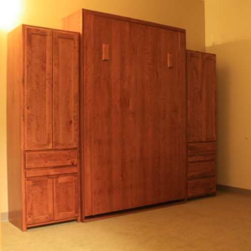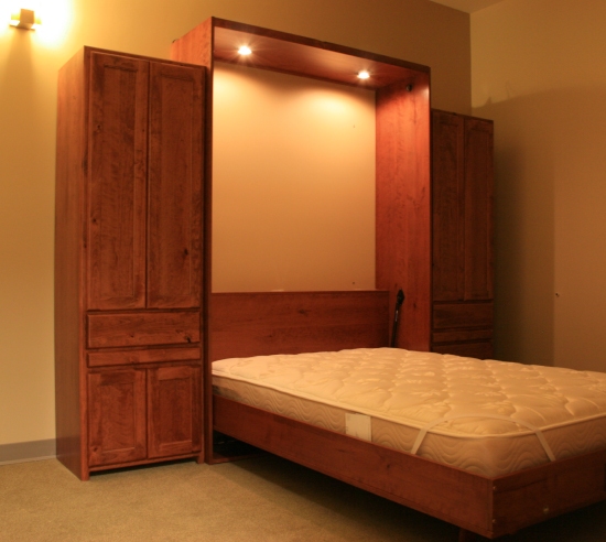 Many of our Wallbeds and Murphy beds have the ISO 9000 rating that you’re looking for in a commercial setting. We offer sizes from Twin to King (see detail for which models are available in which sizes). Most of our Wallbeds are available in the extra long twin or extra long full sizes too. Each of our Wallbeds and Murphy Beds offer optional office components and Storage cabinets, increasing the utility and function of your room. We also offer you the ability to tailor a cabinet or desk to your specific dimensional or functional requirements. Several options are available on our Wallbeds too. Our Drop Down Table is a very popular option for the commercial setting. This Drop Down Table functions as a little desk when you need it and folds up out of the way when you need the extra space.