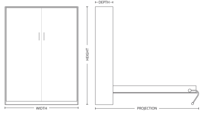 Height Width Depth Projection Queen 88.25″ 65.5″ 16″ 87.5″ Full 83.25″ 59.5″ 16″ 83.5″ Twin 83.25″ 44.5″ 16″ 83.5″ -