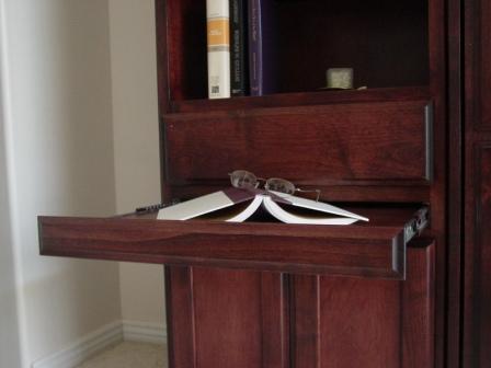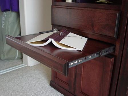 As an addition to any of our many selections of side cabinets, you can add our functional Slide Out Night Tray. This night tray functions like a portable night stand. You have the convenience of the night stand at the bed side when you want it, and it slides away when you need the space. This night tray is positioned above the lower cabinet or above the middle drawer in cabinets that have drawers in the lower area, and rolls out at mattress height making it extremely convenient to use. When the night tray is closed it appears to be a beautiful trim on the face of the cabinet. If you pull on this trim it rolls straight out and becomes a handy little night tray. The night tray is attached to “Accuride” full extension 100 lb glides, so it’s as durable as you will ever need it to be. This night tray allows your guests to keep things close at hand throughout the night, like reading glasses, a book, cell phone, medications or a glass of water. What a great way to show your guests that you are concerned for their comfort.