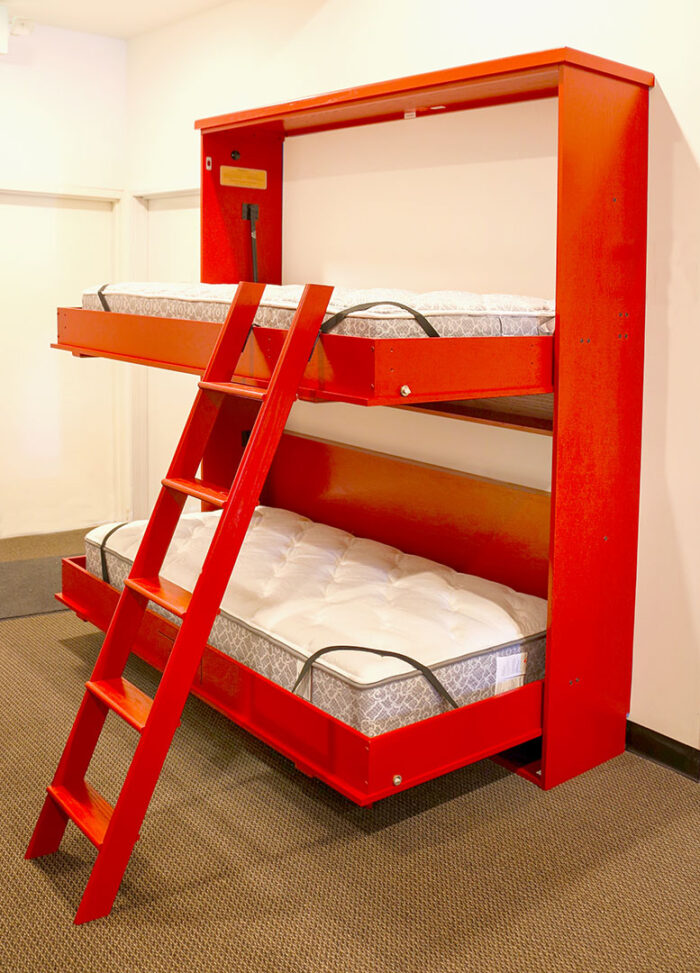 Bunk Wall Beds: Not only are our Bunk Wall Beds perfect for the kids in your life, but they can also be utilized for different reasons including: guest rooms at the cabin, dorm rooms, and fire stations. These beds also feature our patented “whisper quiet” piston lift system that is guaranteed for life.