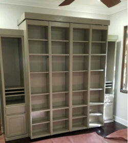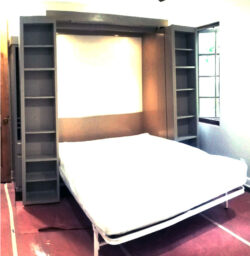 The second item that I got really excited about was Wilding Wallbeds Bi-Fold Bookcase Wallbed. As you view this item from the front, it is a five and a half foot wide, seven foot tall bookcase unit.Using a hidden locking system you can release the right and left face pieces. These face pieces fold in half and swing to each side, revealing a hidden, queen size Murphy bed frame and mattress.This unit gives you the ability to hide a guest room right in your living room or family room or any other room in the home. These Bookcase Wallbeds come in full size and twin size too. Wilding Wallbeds also makes additional bookcase units that can flank the right and left sides to produce an entire wall of book storage.