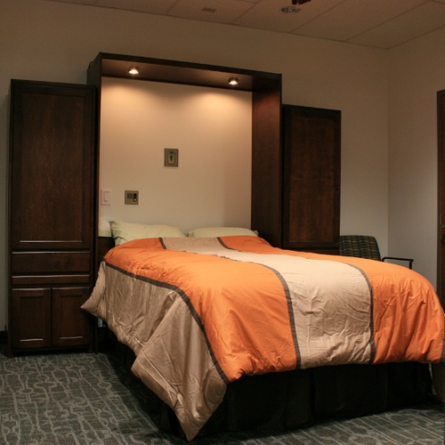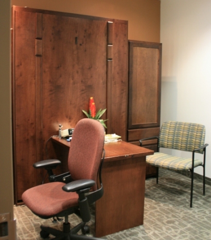 Wilding Wallbeds are certainly not just for home use. Wallbeds are gaining popularity by leaps and bounds for the professional setting too. Wilding Wallbeds add order, beauty and function to any commercial setting. Firehouses, Sleep Labs, Hotels & Motels, Time shares, Hospitals and Shelters are perfect examples of this. These beautiful Wallbeds and Murphy beds provide a wonderfully professional setting during the day and give a wonderfully comfortable night’s sleep during the night.