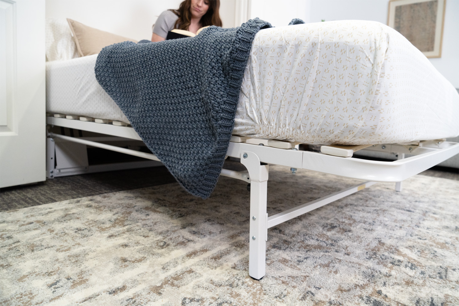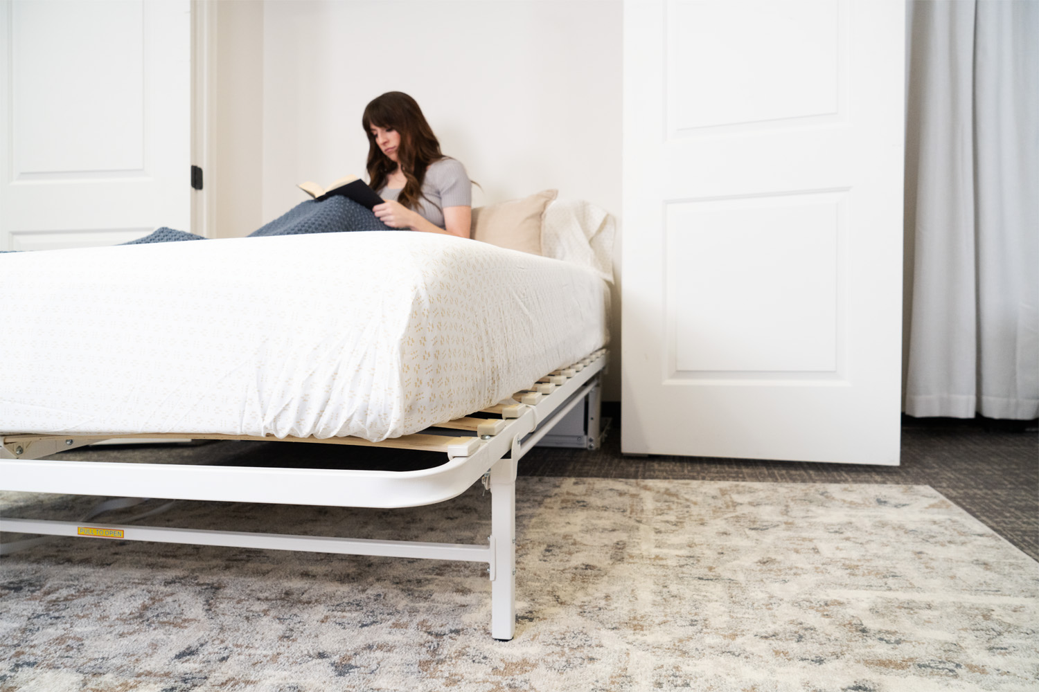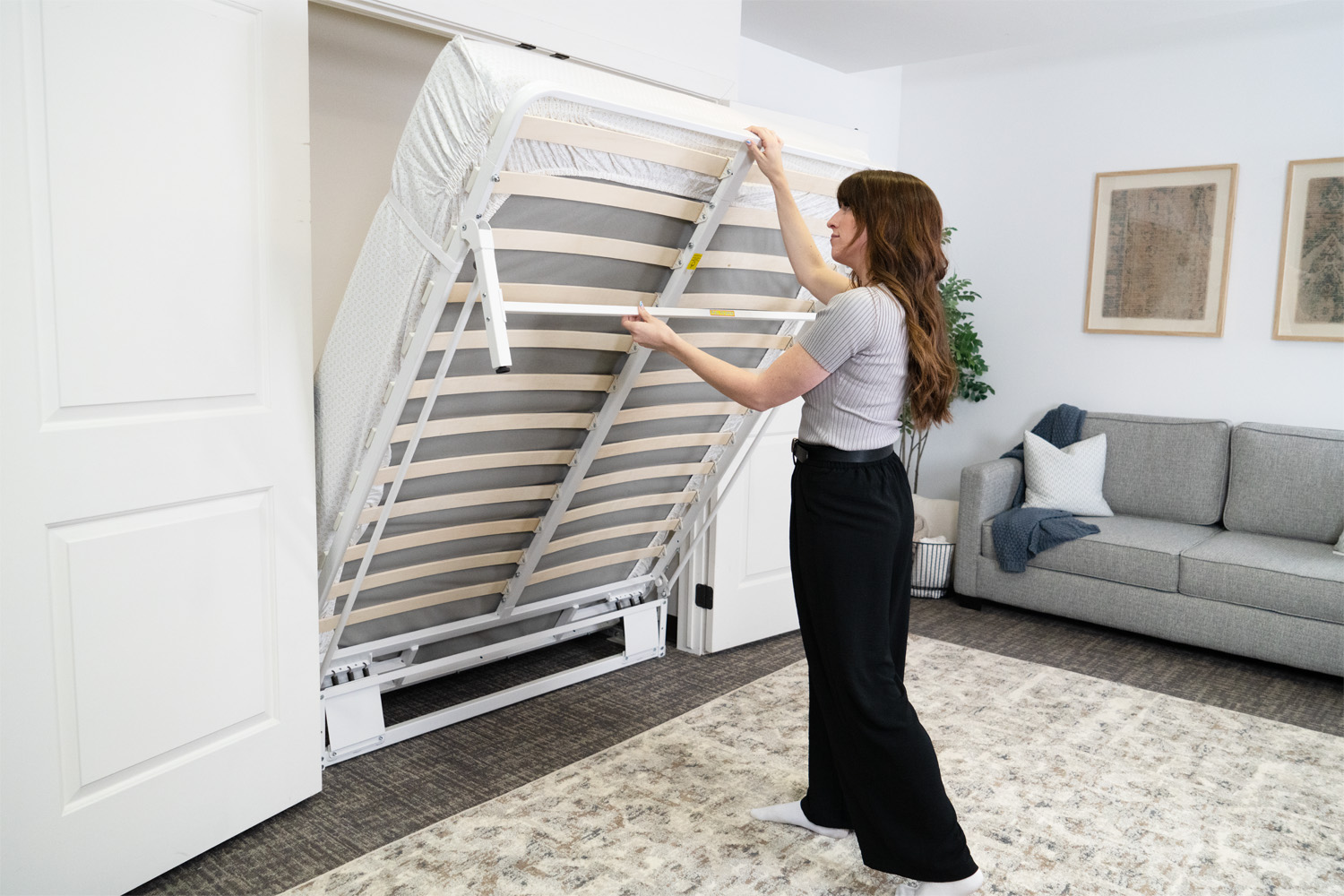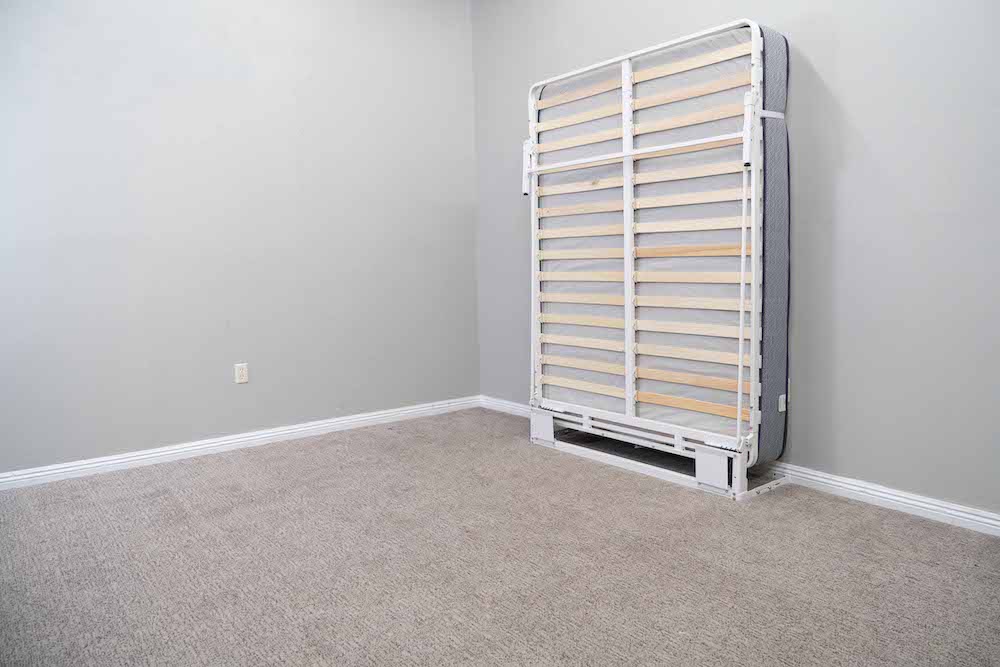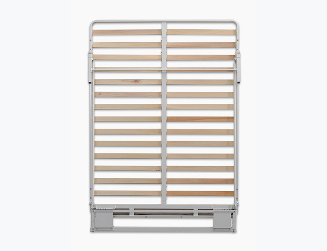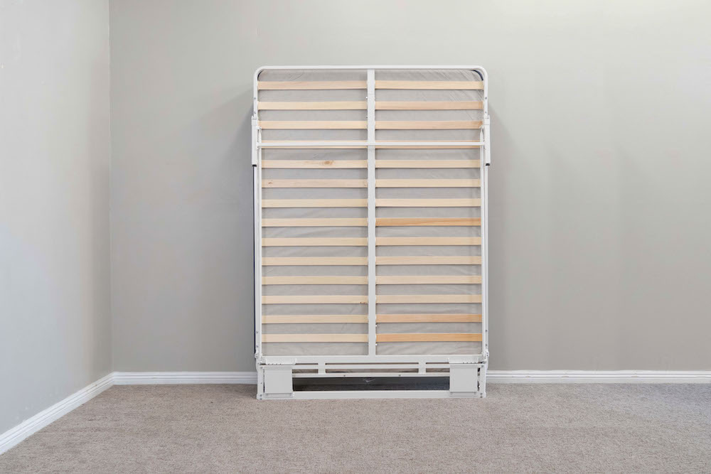 The F-200 Murphy Frame offers many of the benefits of other Murphy Beds but at a fraction of the cost. It is available in twin through queen sizes. Its European slat system provides the ultimate in mattress support. The F-200 Murphy Frame is sturdily built using a commercial rated white-powder-coated tubular steel frame. It can be set up inside an existing closet or niche of appropriate dimensions — or it can be set up directly onto your wall. It easily attaches to the base of the wall or, optionally, to the floor. The Murphy Frame is very easy to lower and raise. It ships to you disassembled and typically takes about 90 minutes to set up. For the most attractive appearance, you may also want to install doors or curtains to hide the Murphy Frame when it is in the “up” position.