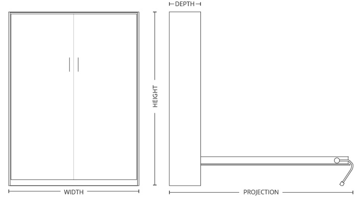 Vertical Dimensions Height Width Depth Projection King 88.25″ 81.5″ 16″ 90″ Queen 88.25″ 65.5″ 16″ 90″ Full 83.25″ 59.5″ 16″ 86″ Twin 83.25″ 44.5″ 16″ 86″ Side Mount Dimensions