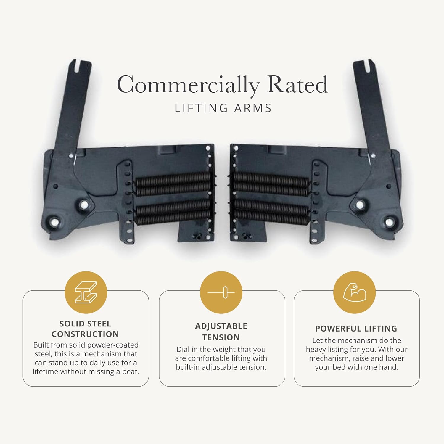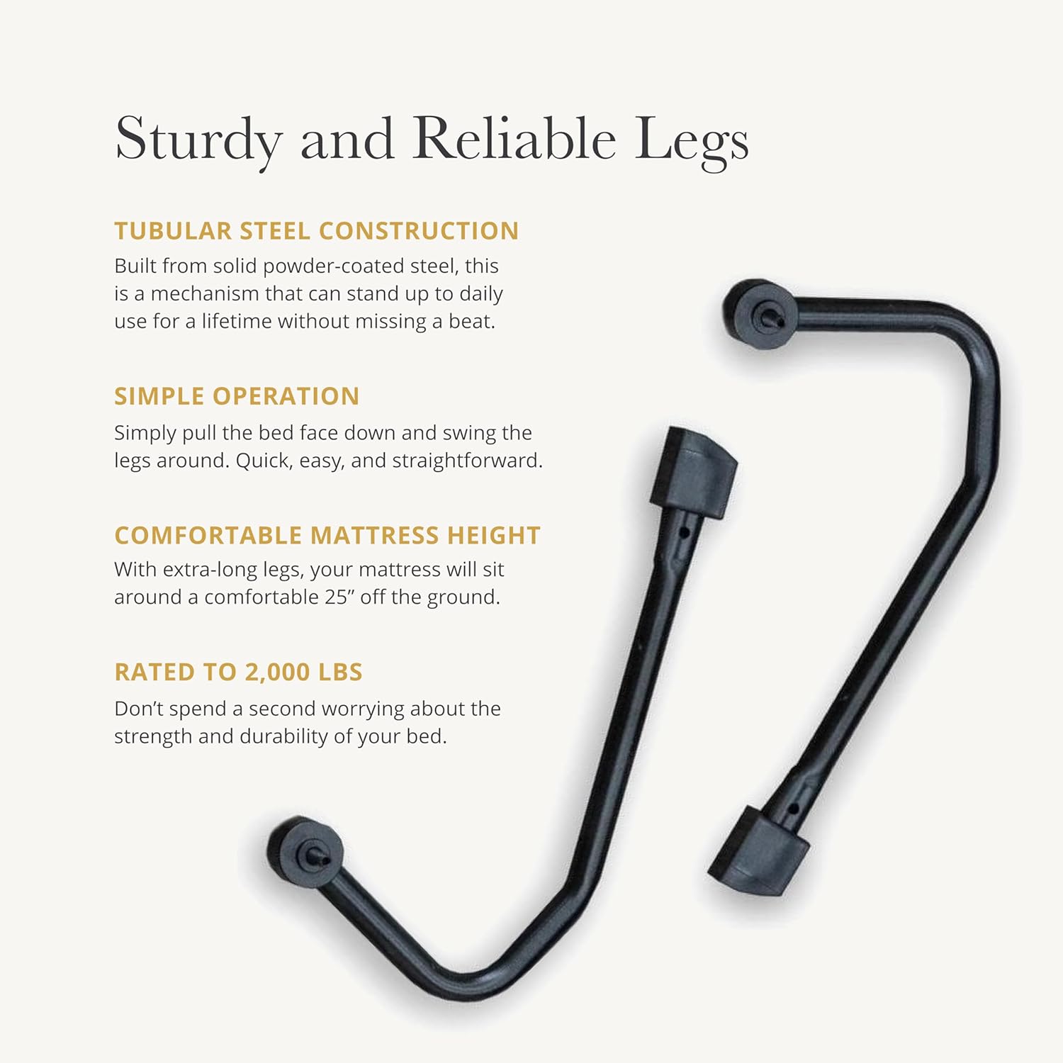- Includes lifting arm assembly, steel bed frame, springs, and rotating leg hardware
