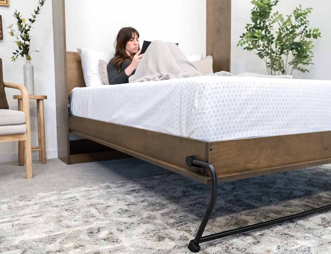 The P-100 Murphy bed mechanism is the perfect solution for cabinet shops and DIYers. The lifting arm assembly is the same mechanism that we use in all of our HomeFront Series Murphy beds. It includes the lifting mechanism, the springs,  and the legs. The Murphy bed mechanism also includes the cut list and plans to show you exactly what you need to build your very own Murphy bed. All you need to supply is the wood, and any handles or other hardware you may want to dress your Murphy bed up. This mechanism is commercially rated and has been designed for daily use, so it is the best option for cabinet shops looking to build a high-end Murphy bed for their customers.