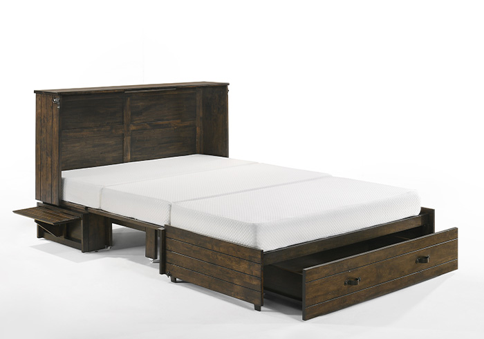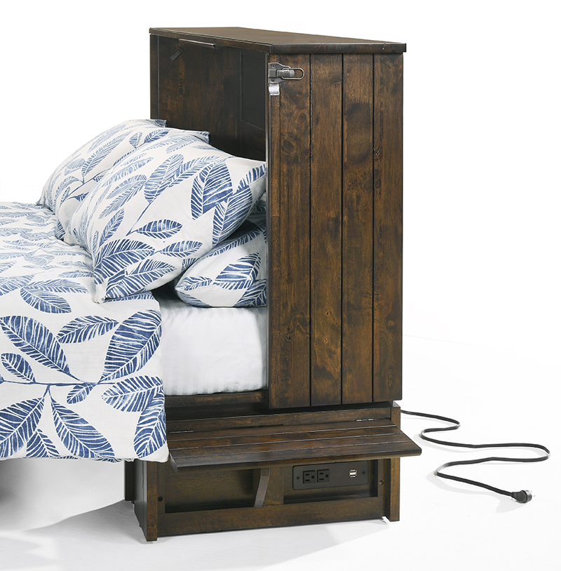 These freestanding beds are versatile, suitable for rooms with low ceilings or rental situations where wall or floor attachments are not possible. The gel-infused memory foam mattress is comfortable and durable, supporting up to 600 lbs for two adults. Flip-up nightstands and built-in power outlets add convenience for guests. While not manufactured by Wilding Wallbeds, the Murphy Cabinet Bed upholds similar standards of wood construction, attention to detail, and durability.