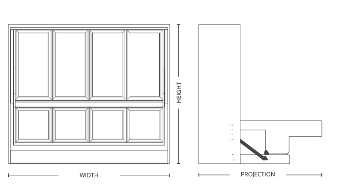 Height Width Depth* Projection Queen 75″ 86.25″ 46.5″ 67″ Full 69″ 81.5″ 46.5″ 61″ Twin 58″ 81.5″ 46.5″ 50″