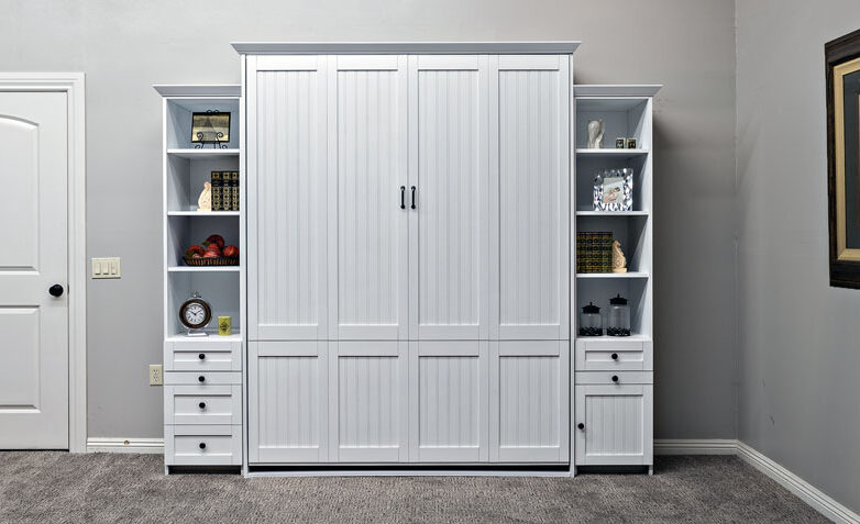 Price as shown $7,573. Price includes Queen size Hampton Wall Bed in Paint Grade Wood / White Finish, Left 18" Hutch Door and Drawer, Right 18" Hutch 3 Drawer, and LED Wallbed Lighting System. Shipping Sale! For a limited time, Wilding Wallbeds will pay up to $400 of your shipping.