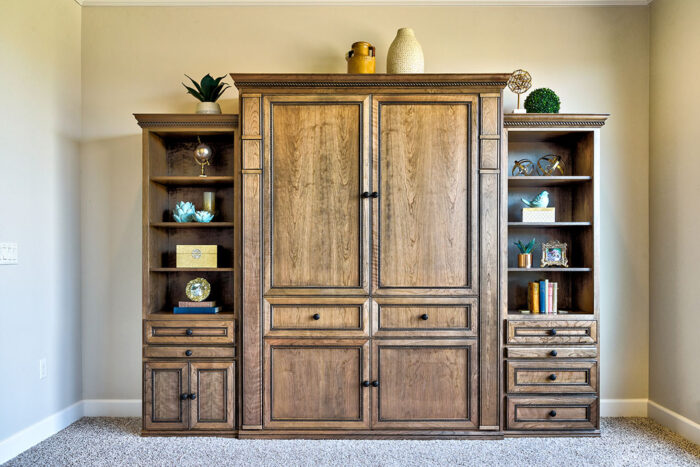 Price as shown $8,679. Price includes our Queen size Tuscany Wall Bed in Rustic Cherry Wood / Autumn Haze Finish, two 24" Deluxe Door & Drawer side cabinets with Upper Clear Glass Doors, Glass Shelves and Slide Out Trays. Shipping Sale! For a limited time, Wilding Wallbeds will pay up to $400 of your shipping.