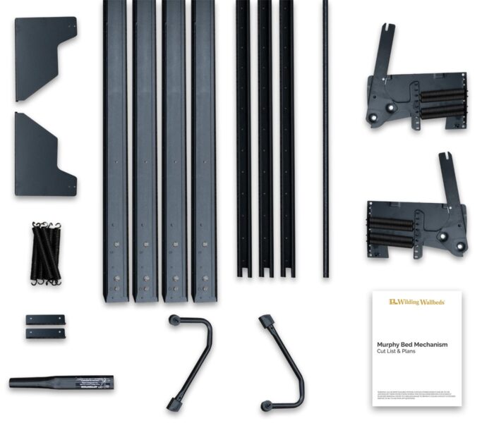 Our selection of Murphy Bed Mechanisms are commercial-grade, spring or piston-driven systems designed for those who want to build a custom cabinet around the bed. These mechanisms include everything you need for the bed’s function—mechanism plates, swing arms, springs, a bed frame, legs, and all required hardware, depending on the mechanism you choose. They also have an instruction booklet and a cut list to guide your cabinet construction.
