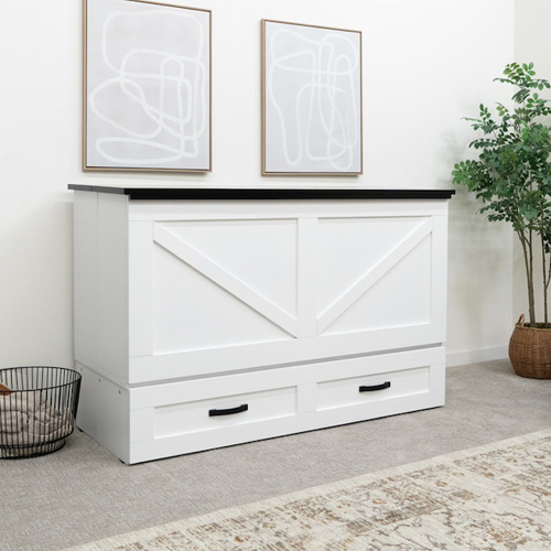 When a Murphy Bed is stowed, it looks like a large cabinet, desk, or shelves depending on the style you choose. It has often been confused with a Daybed, which is a bed that folds down into a couch, or a Trundle bed, which is a bed frame that has another mattress slide on the bottom.